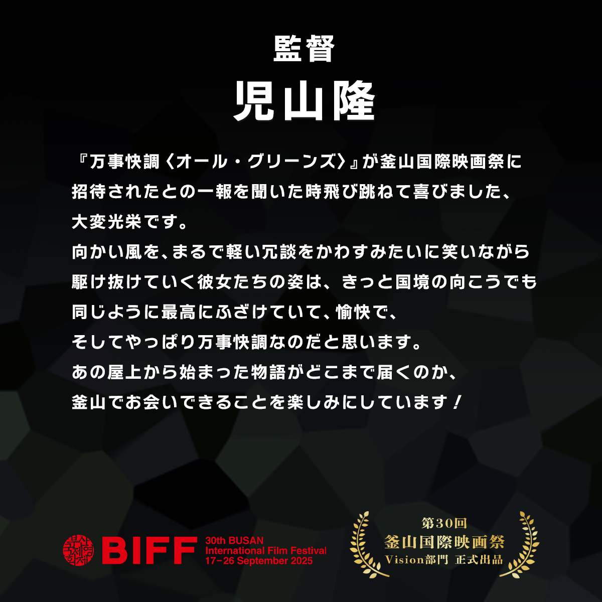今回、映画『万事快調〈オール・グリーンズ〉』は、韓国・アジアの新しい才能の発掘を目的としたVision部門での上映となり、従来の映画祭の枠にとらわれない、多様なジャンルや表現形式の長編映画が対象となる。